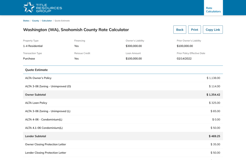 The calculator returns a detailed breakdown of the estimated title insurance premiums, including: